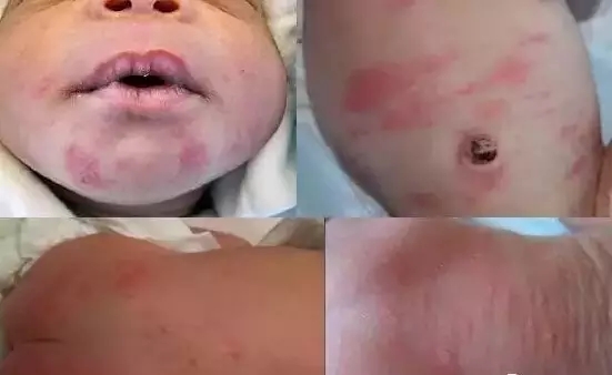 表現(xiàn)為水瘡和紅斑,伴有皮膚組織腫脹現(xiàn)象,很癢,抓撓后有黃色漿液滲出和出血。