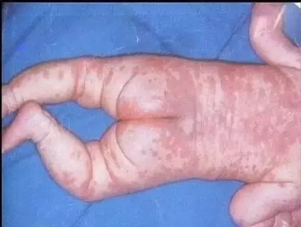 表現(xiàn)為皮膚潮紅,小斑丘疹上溢出淡黃色脂性液體覆蓋在皮疹上,以后結成較厚的黃色痂皮,不易除去,以頭頂及眉際、鼻旁、耳后多見,但是癢感不太明顯。