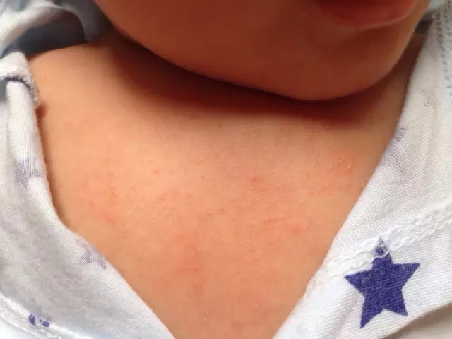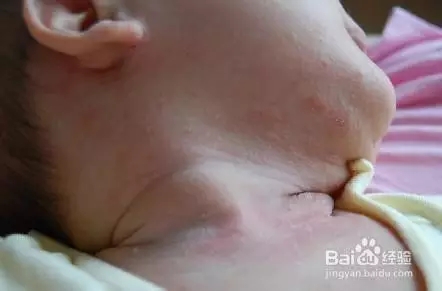 這張圖里寶寶脖子上的熱疹已開始連成一片,盡管如此但還是能看出有粒粒小疹子存在,這種情況在1歲內的嬰兒里面比較常見,民間習慣把這叫“淹脖子”。